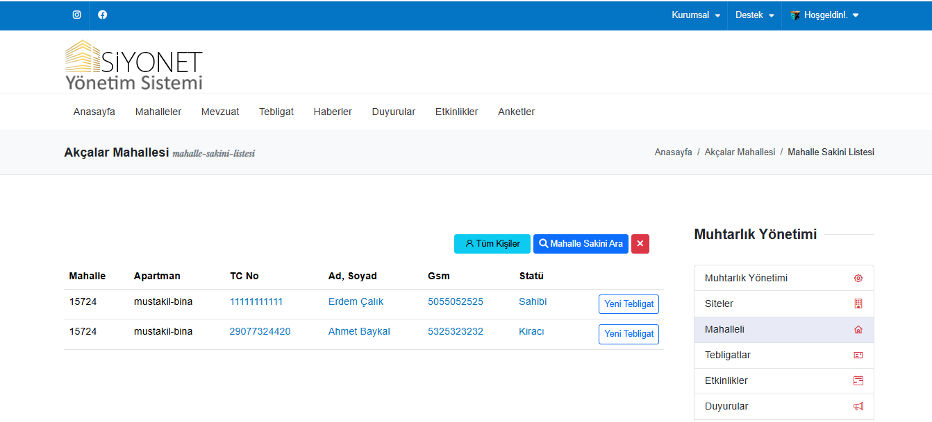 Siyonet Muhtar Yönetim Sistemi, mahalle halkına yönelik duyuruların ve etkinliklerin kolayca paylaşılmasını sağlar.
